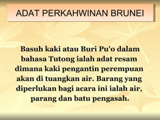 Adat Merisik dan Meminang. Adat resam kahwin melayu antara adat resam yang paling penting dan dipegang teguh oleh. Dalam adat perkahwinan suku kaum Brunei majlis akad nikah ini dilangsungkan di rumah bakal pengantin perempuan pada sebelah petang hari jumaat kira-kira jam 2 hingga 3 petang ataupun pada hari sabtu pagi kira-kira pada pukul 10 hingga 11 pagi.