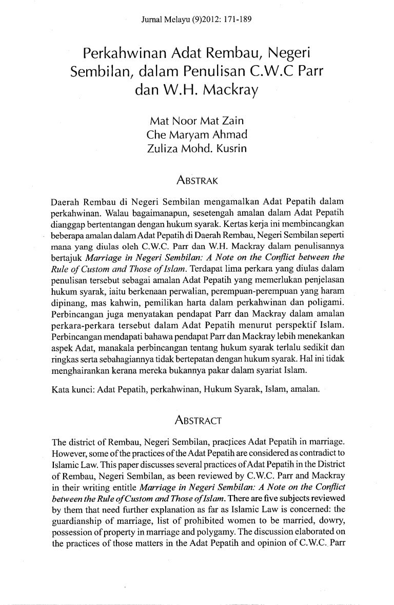 Merawin da lam Kep impinan. Daripada Jawi Peranakan kepada Melayu. 171-189 Perkahwinan Adat Rembau Negeri Sembilan dalam Penulisan CWC Parr dan WH.