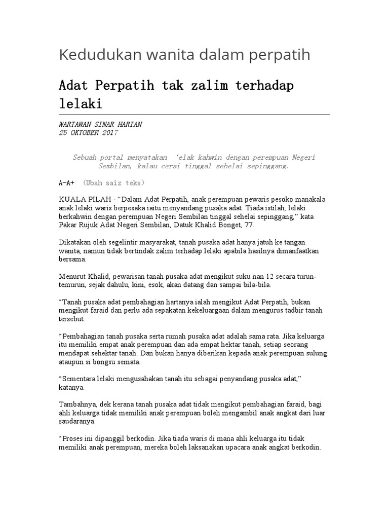Bab 1- Pengenalan Malaycivilization Skip to main content. Adat Perpatih adalah satu sistem kemasyarakatan yang lengkap. TERIMAKASIH ANUGERAH ADAT PERPATIH WILAYAH NANING AHLI MANGKU NANING AMN.