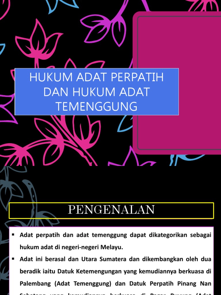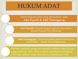 La melibatkan kajian mengenai sejarah kedatangan Adat. Mereka ini sangat rapat dan lazimnya tinggal di sesuatu perkampungan atau kawasan y. Adat Perpatih dan Adat Temenggung dapat dikategorikan sebagai hukum adat di negeri-negeri Melayu.