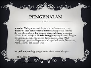 5 pengenalan amadun melayu merujuk kepada sebuah tamadun yang dibentuk oleh sekelompok manusia yang secara luasnya digolongkan sebagai kumpulan orang melayu tertumpu kepada suatu wilayah di asia tenggara yang dikenali dengan pelbagai nama seperti gugusan kepulauan melayu malay archipelago gugusan kepulauan melayu-indonesia. Sejarah Tamadun Melayu Friday September 10 2010. Tamadun India banyak mempengaruhi adat dan budaya masyarakat melayu di Malaysia Tamadun India banyak mempengaruhi adat dan budaya masyarakat melayu di Malaysia.