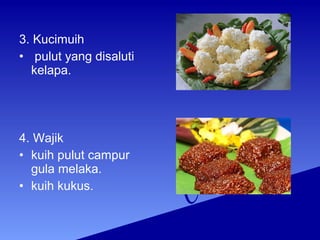 Kuih CorotSelorot Gambar 11. Makanan tradisional masyarakat Melayu Sarawak ini boleh dibahagikan kepada dua iaitu pencuci mulutkuih-muih dan makanan berat. Pengenalan sejarah Makanan Tradisional di Malaysia.